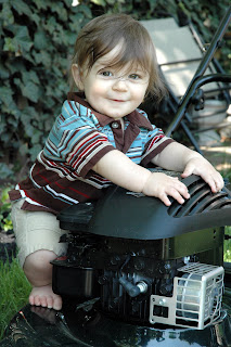 We've been spending a lot of time outside in the nice weather. As you can see, Alex is becoming acquainted with the lawnmower. Omar says that he'll be out mowing the lawn in no time. We've planted a vegetable garden and are enjoying watching everything grow. He loves to play soccer with us, and likes his new golf clubs. He actually hits the ball!