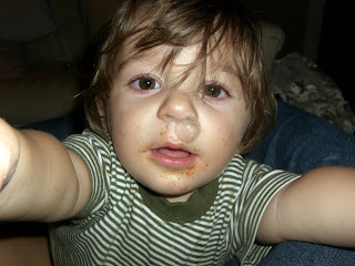 This is Alex's snot bubble. Pretty gross, huh? He's getting over a little cold, and today during dinner he sneezed a bubble that lasted an amazingly long time! Well, we thought it was funny...