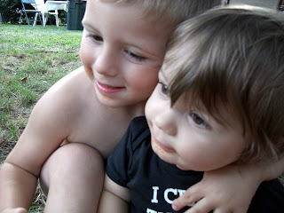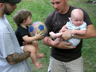 We had what I guess was a "make-up" party for some of our dear friends who couldn't make it out the weekend before for the big birthday party. Alex had a great time with everyone. He got a lot more toys and, thank goodness, some clothes. He loves his ride-on airplane, since that's what he is into now. He also got a little push-toy "lawnmower" that he tears around the house with. He's really good at walking with it- when he gets stuck he scoots it right back straight and keeps on going. It won't be long before I'm running after him!