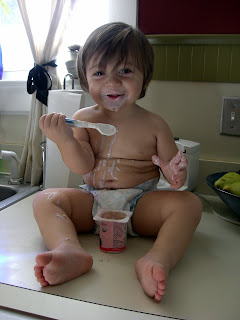 Alex has started to feed himself with a spoon. Messily, but he's doing it! He runs all over the place. "If you're happy and you know it..." is the current fave- he loves to stomp his feet. Alex has 6 teeth and is working on 8. He's picked up some new signs: Daddy taught him "more", which he is now combining to make short sentences- "more drink" and "drink milk". He signs "lion", "elephant", "giraffe", and "hippo" now. Alex says "Daddy" all the time, and hardly ever says "mama" anymore. His speech has been changing- his babbles have become very conversational and expressive. You can tell he's picking up the cadence of the langauge. He loves bath time. Alex also loves to do clean-up. He dances while we sing the "clean-up song".